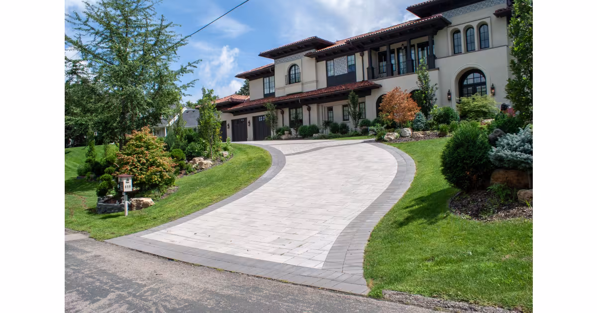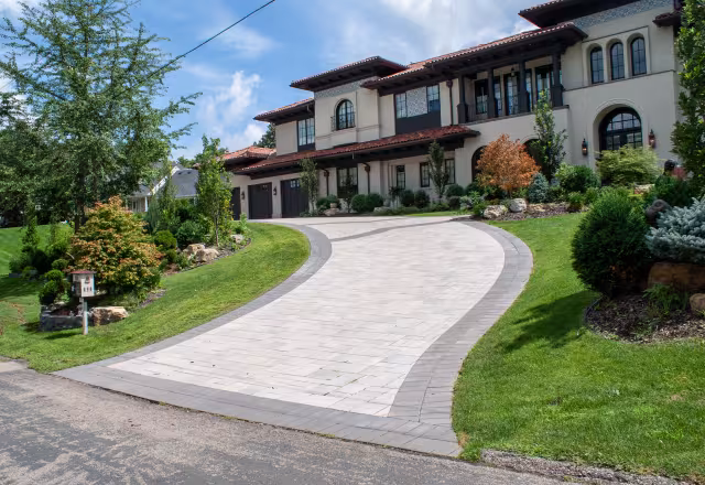 This Techo-Bloc driveway features smooth, precisely laid Blu 80mm pavers in a refined greyed nickel tone that balances modern restraint with quiet elegance. The subtle curve of the drive softens the hardscape while guiding the eye naturally toward the home, creating a sense of flow rather than formality. Its clean surface and consistent color palette highlight the quality of the materials and craftsmanship, offering a durable yet visually calm foundation for the property. The neutral greyed finish reflects light gently, giving the driveway a polished, contemporary presence that feels intentional, understated, and built to last. Blu 80mm (6x13) onyx black pavers border the driveway, adding contrast and clarity to the installation.