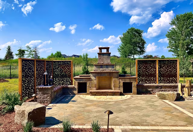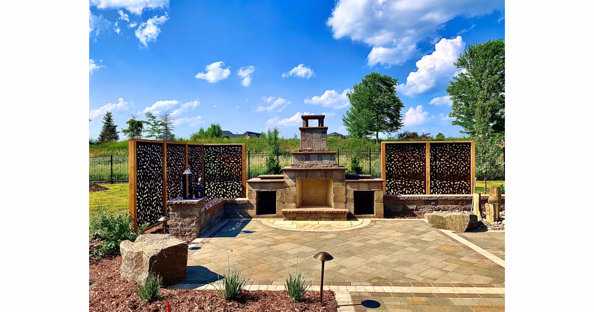 This fire feature creates a bold, inviting outdoor gathering space anchored by a ledgestone fireplace in a rich bronze blend that immediately draws the eye. Outdeco privacy panels frame the area with architectural interest while providing a sense of enclosure, making the space feel both intimate and open. Versalok walls and caps and our basalt columns add layered texture and strength, complemented by natural granite outcroppings that ground the design in the surrounding landscape. Finished with a mixed-material patio, this thoughtfully crafted setting balances warmth, structure, and style—perfect for everything from quiet evenings by the fire to lively outdoor entertaining.