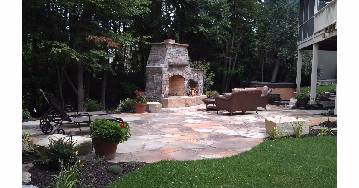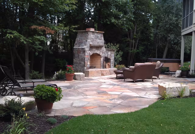 This fireplace-focused patio floored with café flagstone creates a warm, inviting outdoor living space designed for comfort and connection. The natural texture and subtle color variation of the flagstone provide a relaxed, timeless foundation that pairs beautifully with the glow of the stone fireplace. Thoughtfully laid Door County outcroppings define the gathering area while also inviting one to sit and join in on fireside conversations. Whether used for quiet evenings or lively get-togethers, this patio delivers a cozy atmosphere with lasting beauty, turning the backyard into a true extension of the home.