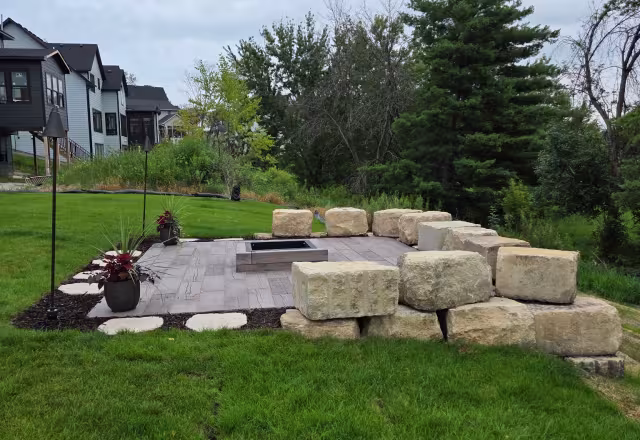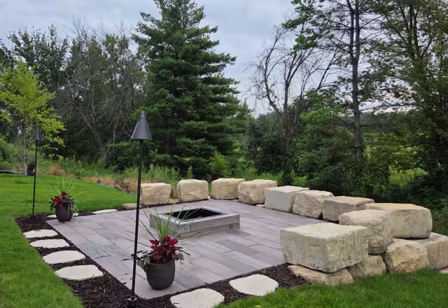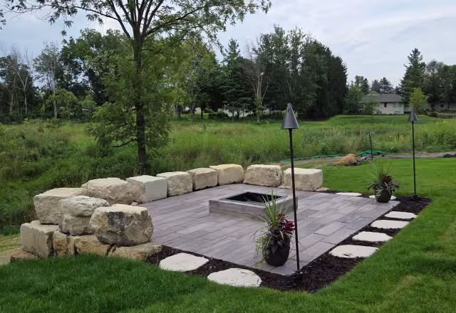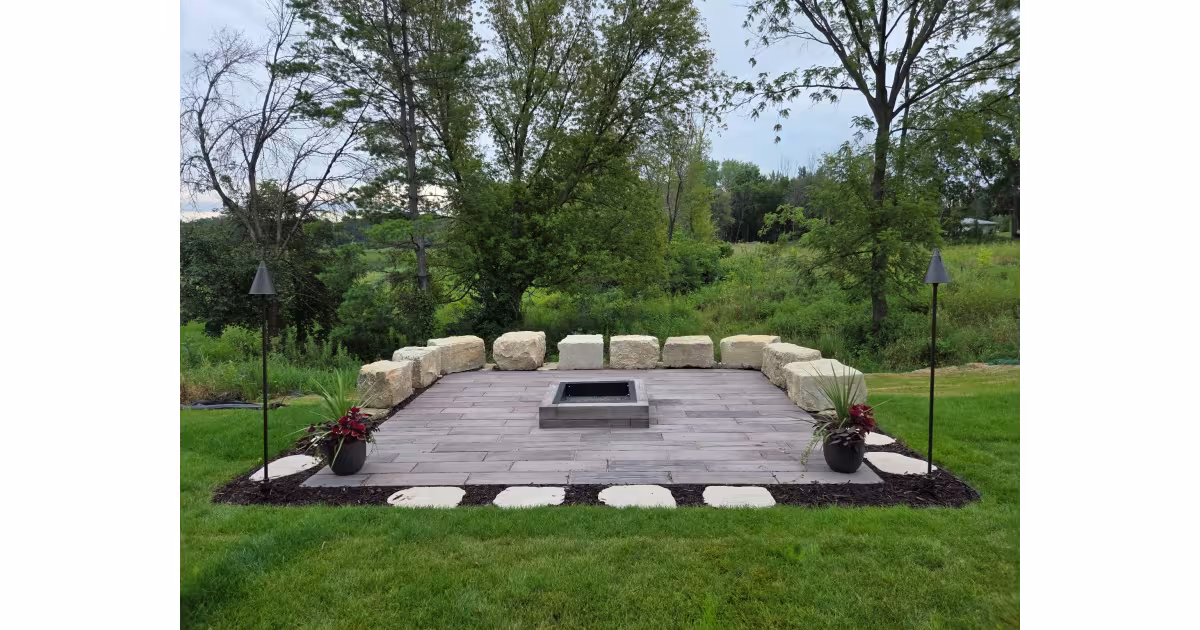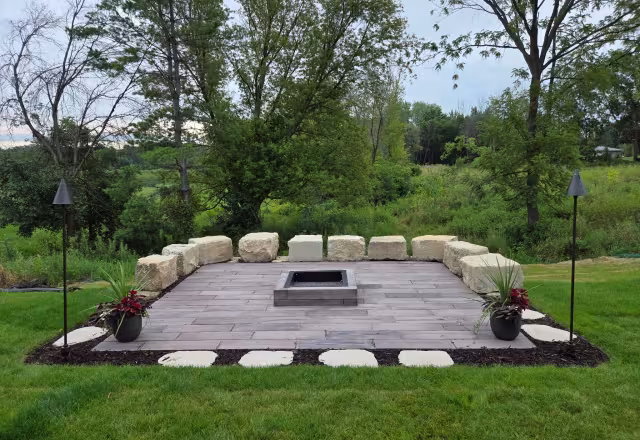 A timeless backyard fire feature surrounded by limestone cubes, Fond du Lac steppers, and RCP Barn Plank pavers. Finished with Alliance TIKI lighting for the perfect evening glow.