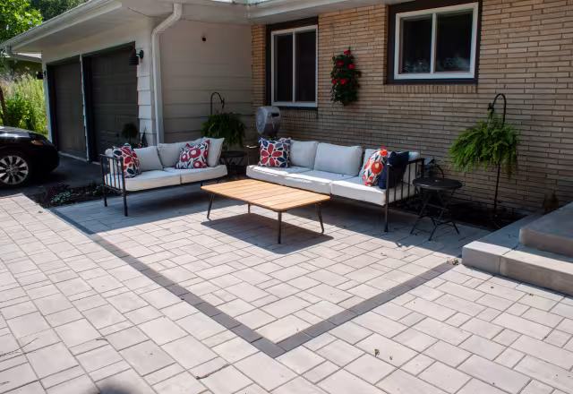 This patio brings allure underfoot by pairing County Materials' Discover Allure pavers with Reflection accents to create a space that feels both inviting and thoughtfully defined. The subtle contrast in color and texture adds visual interest without overwhelming the setting, naturally framing the seating area and encouraging relaxed conversation. Clean lines and precise layout give the patio a polished look, while the soft tones keep it comfortable and approachable. Designed for everyday lounging or casual entertaining, the result is a patio with presence—stylish, functional, and easy to enjoy.