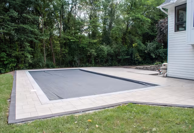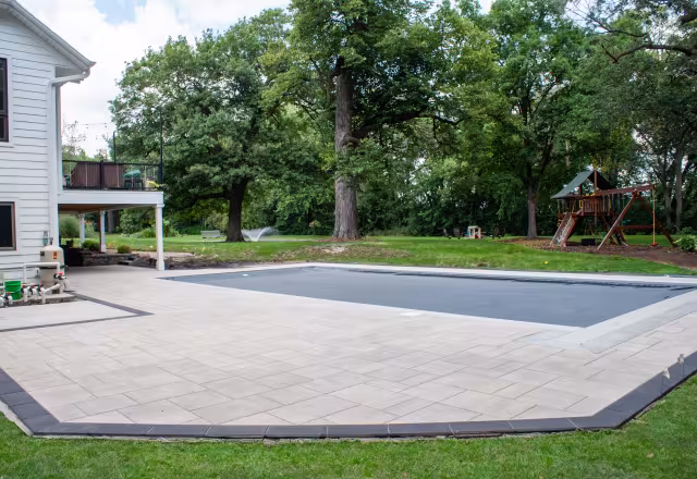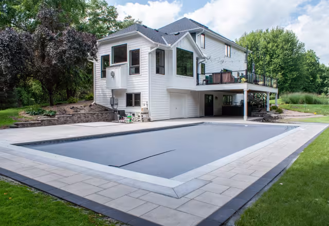 This pool design pairs County Materials' Grand Discover Allure pavers with Tribute Silverstone wallstone to create a clean, contemporary outdoor space that feels both polished and inviting. The smooth, modern lines of the Allure pavers define the pool perimeter with subtle texture and a refined color palette, while the Silverstone wall adds depth, contrast, and a sense of structure. Together, these materials frame the pool with a balanced, architectural look that complements the home and surrounding landscape. The result is a poolscape that feels thoughtfully designed, durable, and ready for relaxed everyday use or entertaining alike.