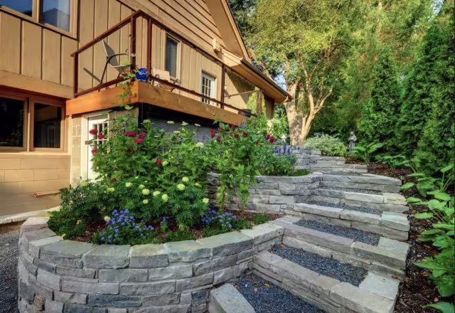 This garden staircase combines our Chilton wallstone with gray trap rock and rich, double ground hardwood mulch to create a layered, natural ascent through the landscape. The solid stone steps provide structure and durability, while the gray trap infill adds texture and contrast between each tier. Lush plantings soften the edges, allowing the staircase to feel integrated into the surrounding garden rather than imposed on it. Hardwood mulch completes the look with warmth and cohesion, resulting in a stairway that feels timeless, grounded, and thoughtfully crafted to complement both the stonework and the plantings.