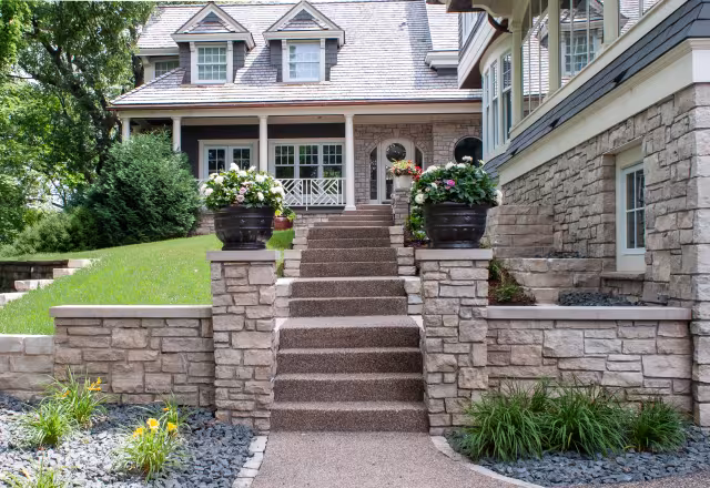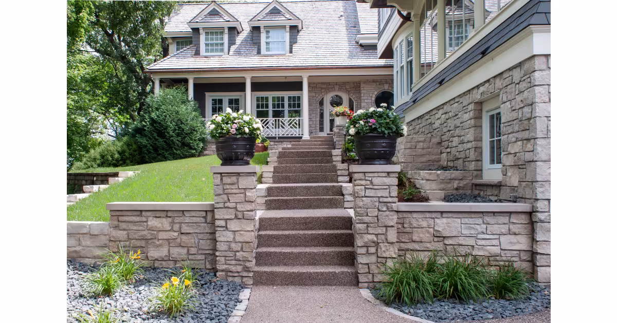 This front walkway creates a composed, welcoming approach by combining our 1.5" gray trap stone with Fond du Lac edging for a look that feels both structured and natural. The steps rise gently between low retaining walls, guiding movement toward the entry with a sense of balance and permanence. Fond du Lac wallstone defines the edges, adding contrast and craftsmanship while anchoring the design visually to the home’s masonry. Clean lines, textured surfaces, and subtle plantings work together to form an entry sequence that feels intentional, timeless, and solidly built.