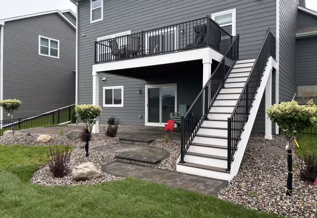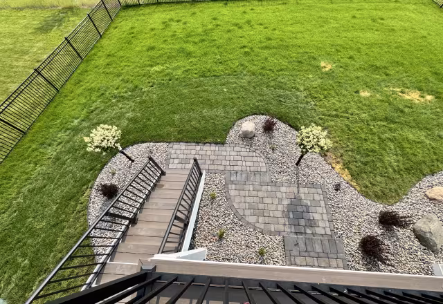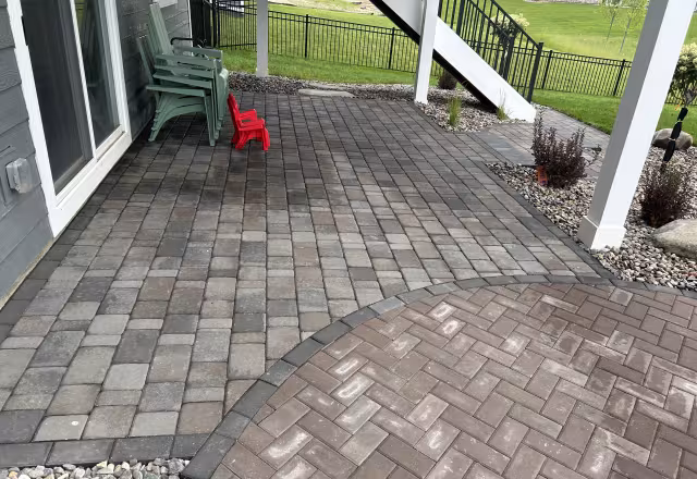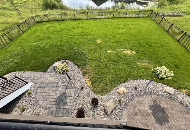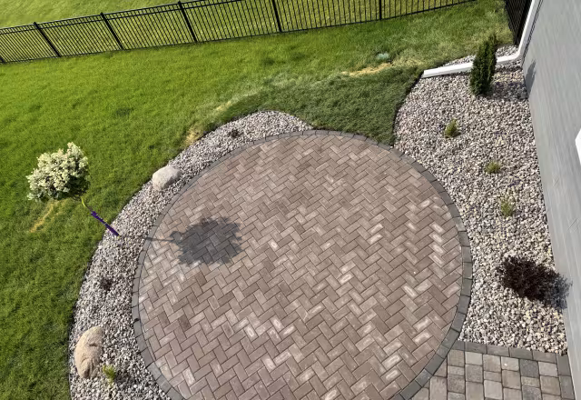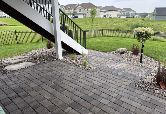 This transformation includes Willow Creek Cobblestone and Brickstone to create a natural flow from the home into the yard. The curved pathways, circular patio, and detailed borders give the design movement and charm, while decorative rock, boulders, and clean plant beds bring balance and softness. The mixed paver styles add depth in both color and texture, making this space feel polished, usable, and ready for anything.