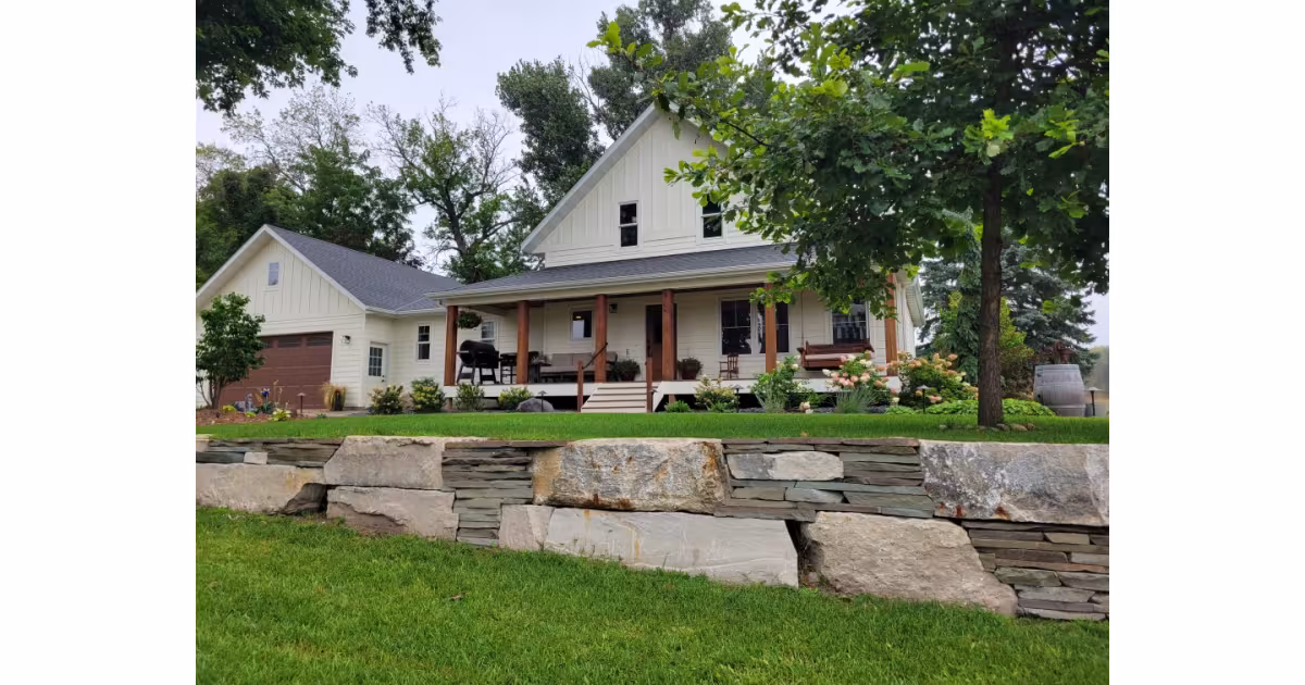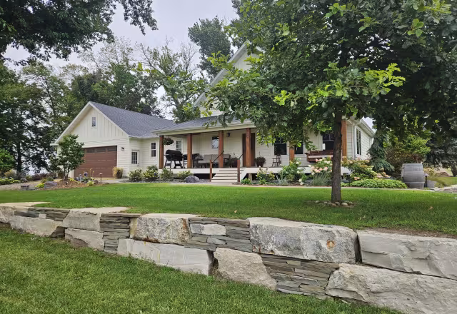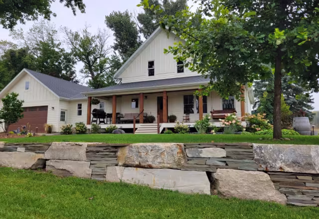 This timeless retaining wall blends Lannon outcropping, Bluestone accents, and Superior boulders to create a farmhouse-inspired backdrop that feels both rustic and refined. The layered stonework adds natural texture and structure to the property, complementing the home’s classic architecture while elevating the surrounding landscape with durable, earthy charm.