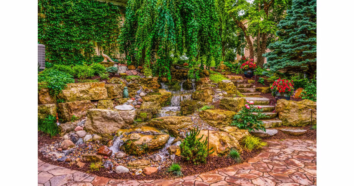 Mossy limestone outcroppings set the stage for a multi-tiered water feature that feels both organic and purposeful. Cut boulder steps guide you upward as water moves through pockets of river rock, each size chosen to create subtle shifts in color and texture. It’s a thoughtful blend of stone and flow—grounded, inviting, and endlessly soothing.